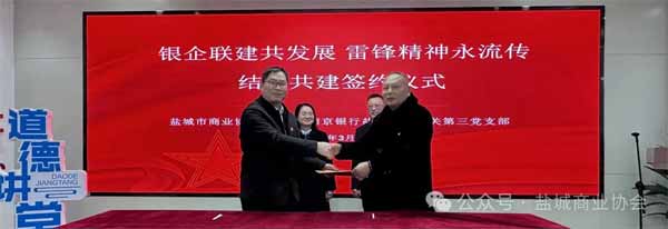 为充分发挥基层党建的核心引领作用,构建结对帮带、双向促进、共同提高的基层党建格局,进一步探索创新党建工作。 3月3日下午,盐城市商业协会党支部与南京银行盐城分行第三党支部党建结对共建签约仪式在南京银行盐城分行党建基地举行,盐城市商业协会会长虞加军,党支部书记倪同国与党员代表参加活动;南京银行盐城分行第三党支部书记严安,小企业金融部总经理柏雪琴与党员代表参加活动。 当天党建活动安排情况: