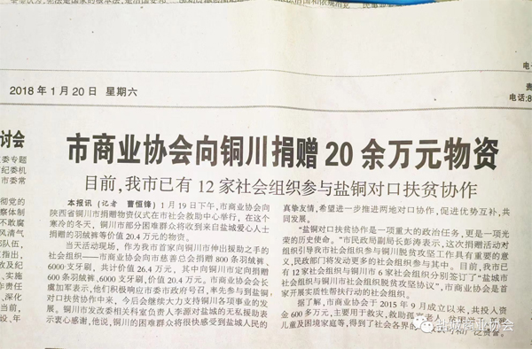 我协会快速响应“盐铜对口扶贫”的号召,2018年1月20日在社会救助中心向陕西铜川困难群众捐赠26.4万元暖冬物资。2018年1月23日在亭湖慈善总会再次向铜川捐赠13.2万元物资。